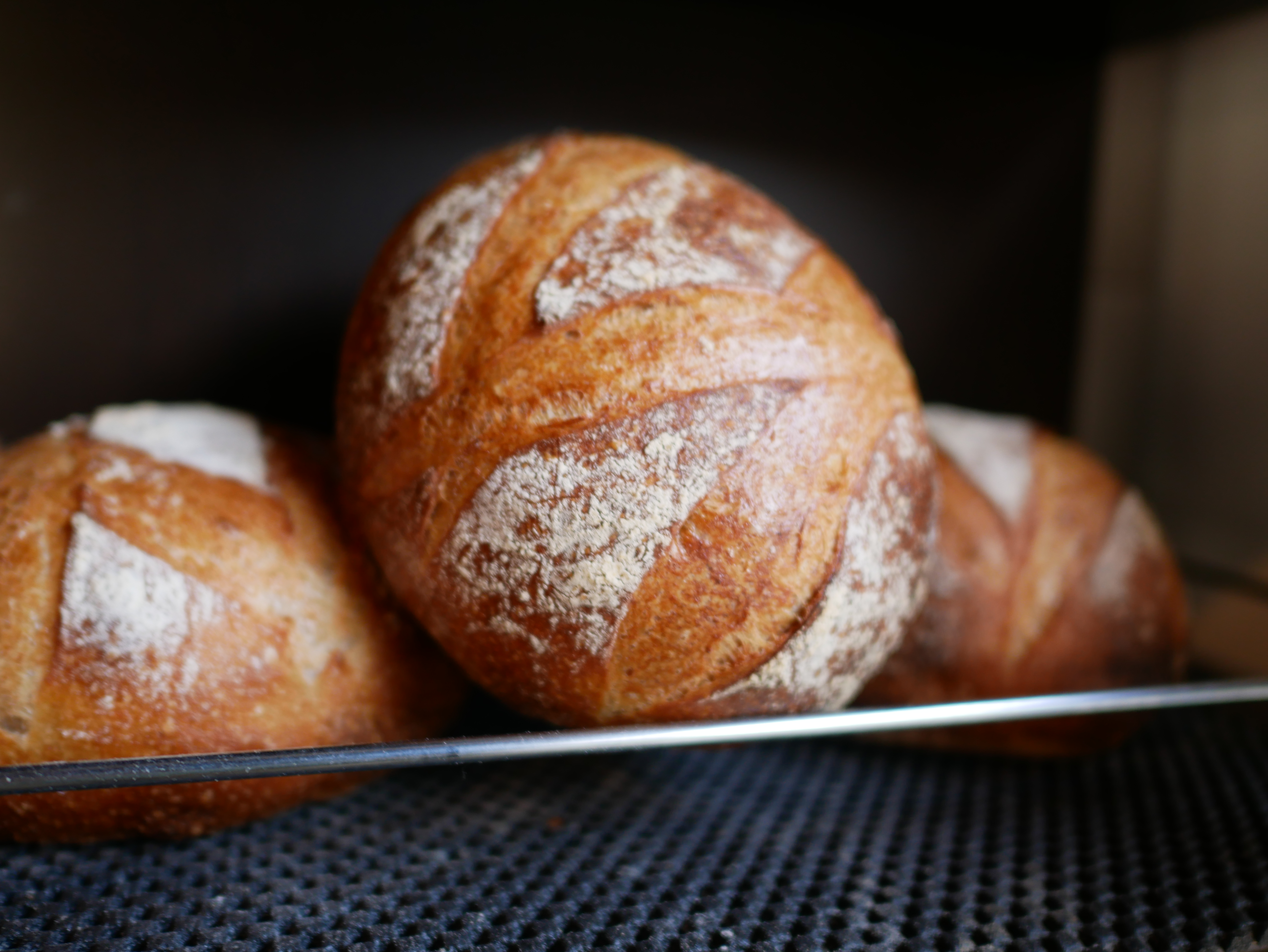 北海道産の有機キタノカオリ玄麦、古代小麦玄麦、ライ麦玄麦をそれぞれ、アトリエの石臼製粉機で挽いた小麦粉を使用して作った食事用フランスパンです。挽きたての小麦粉で作るパンは香りもよく、小麦の味をしっかりと味わえるパンに仕上っています。